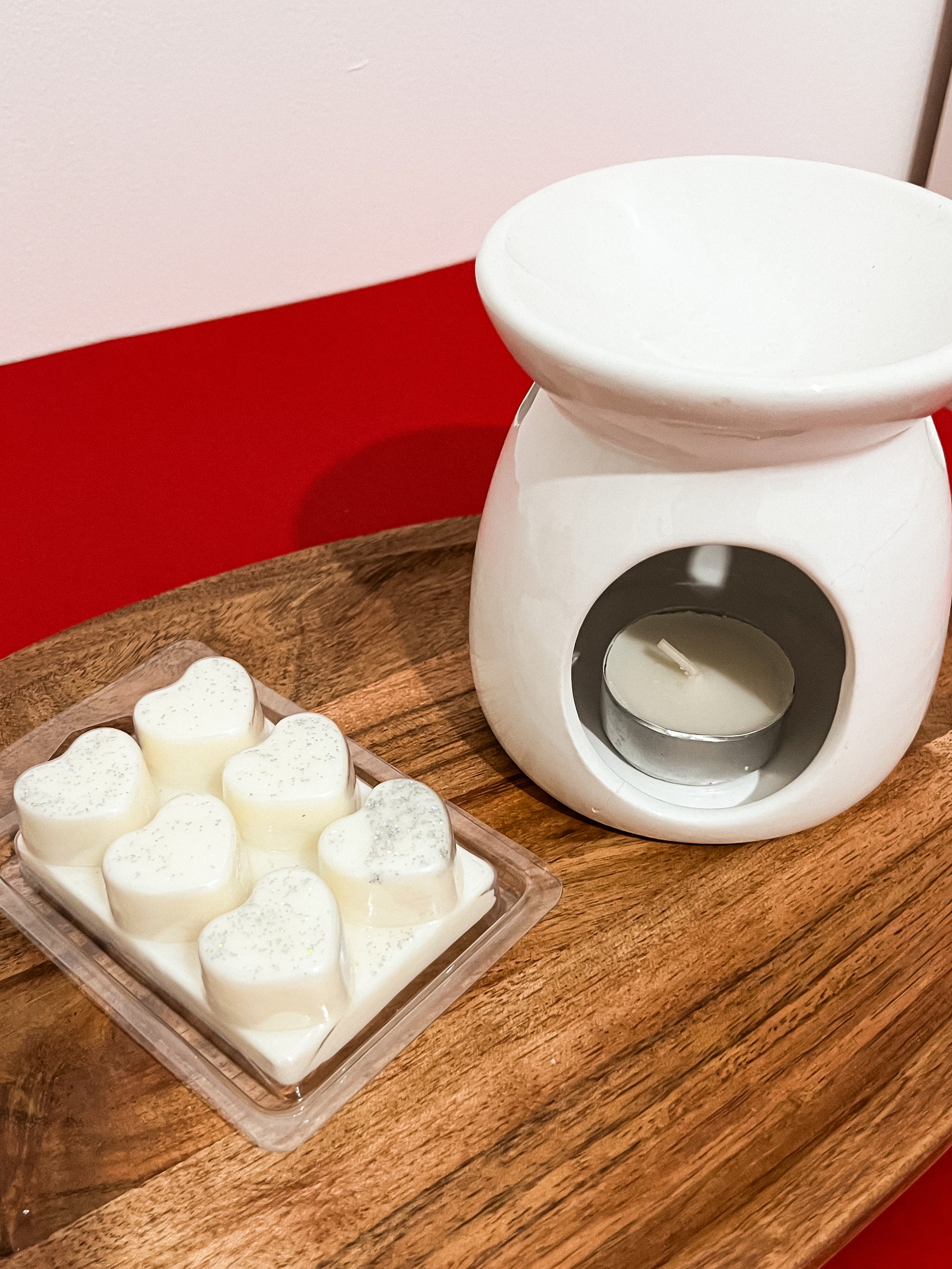 Inclui um queimador e wax melts em forma de coração, pensados para perfumar o espaço de forma suave e contínua.