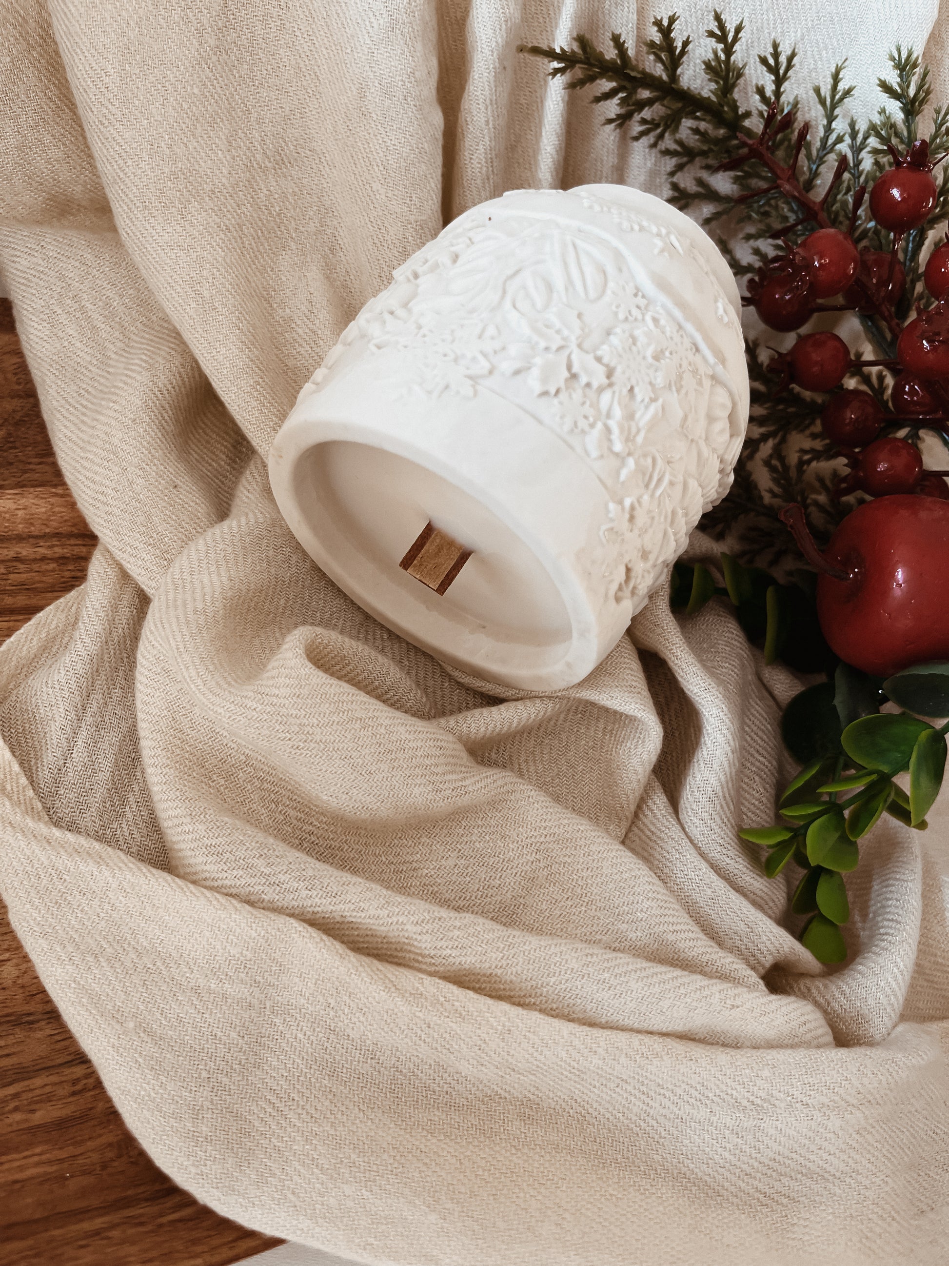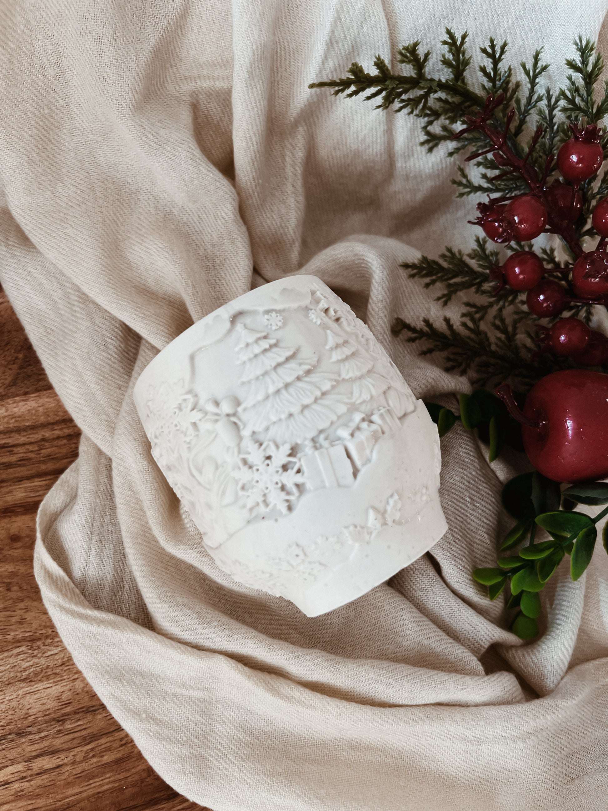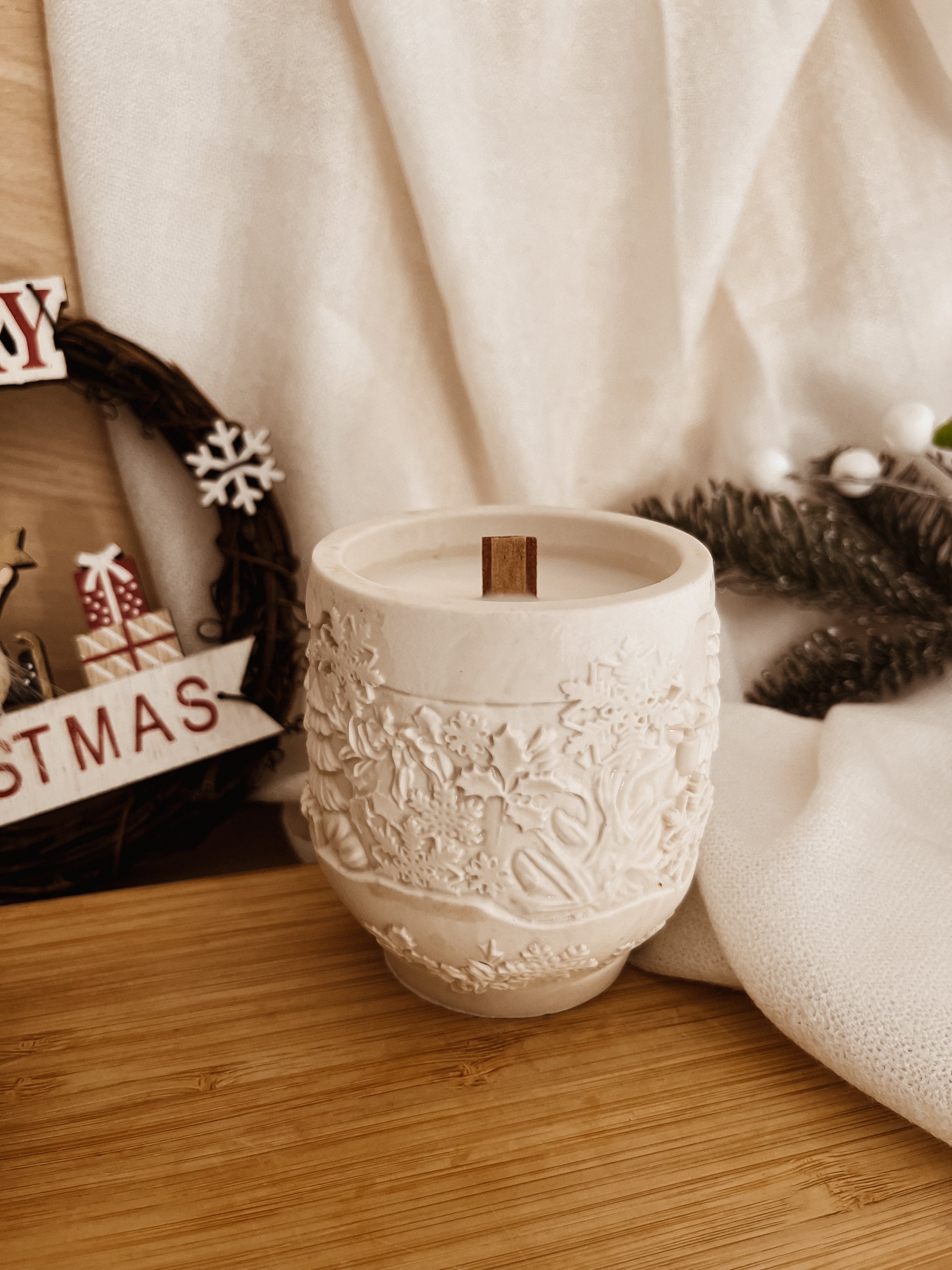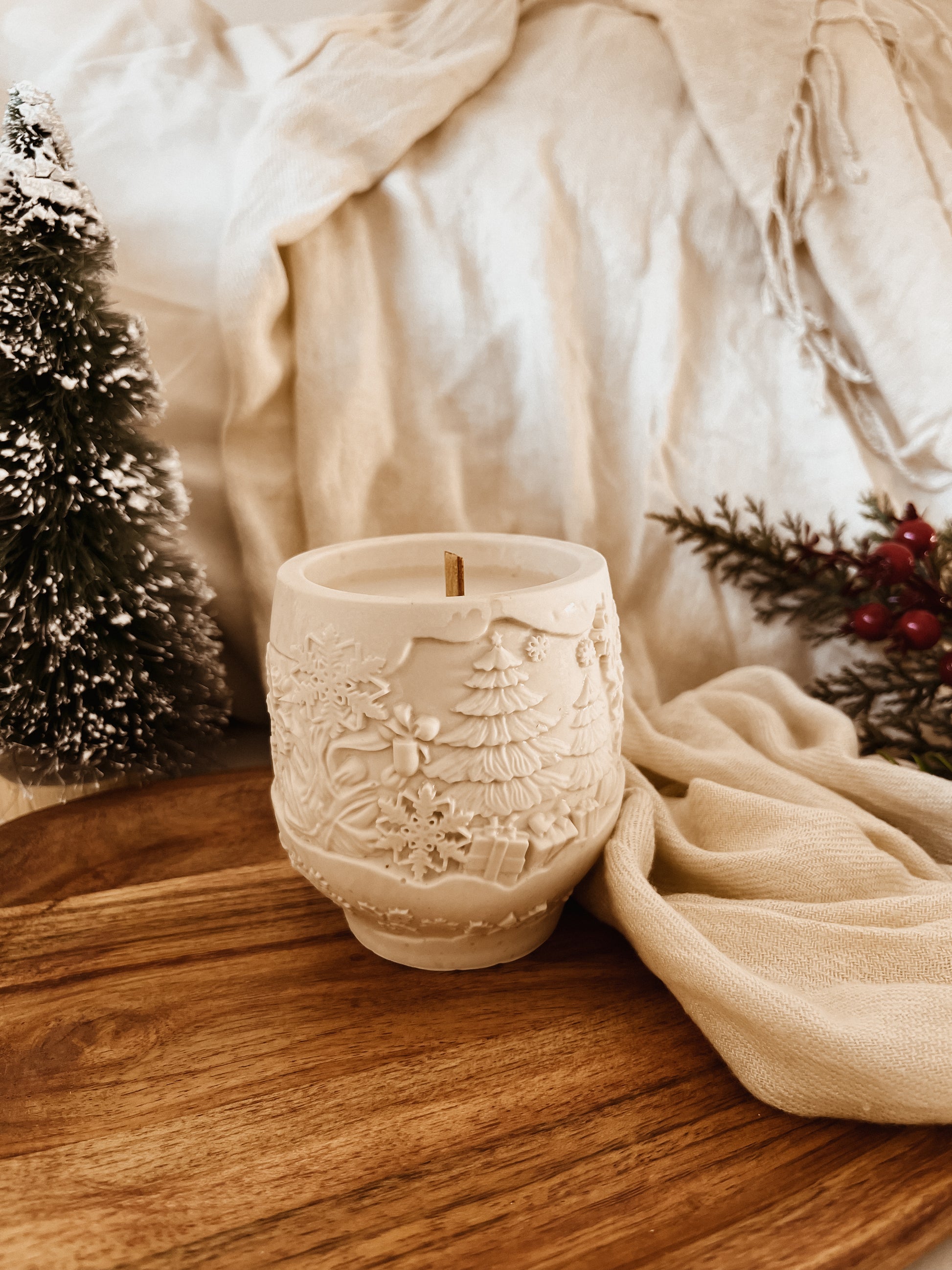 Moldada à mão em jesmonite, um material durável e sofisticado, com desenhos de natal simbolizando a magia e a serenidade do Natal.