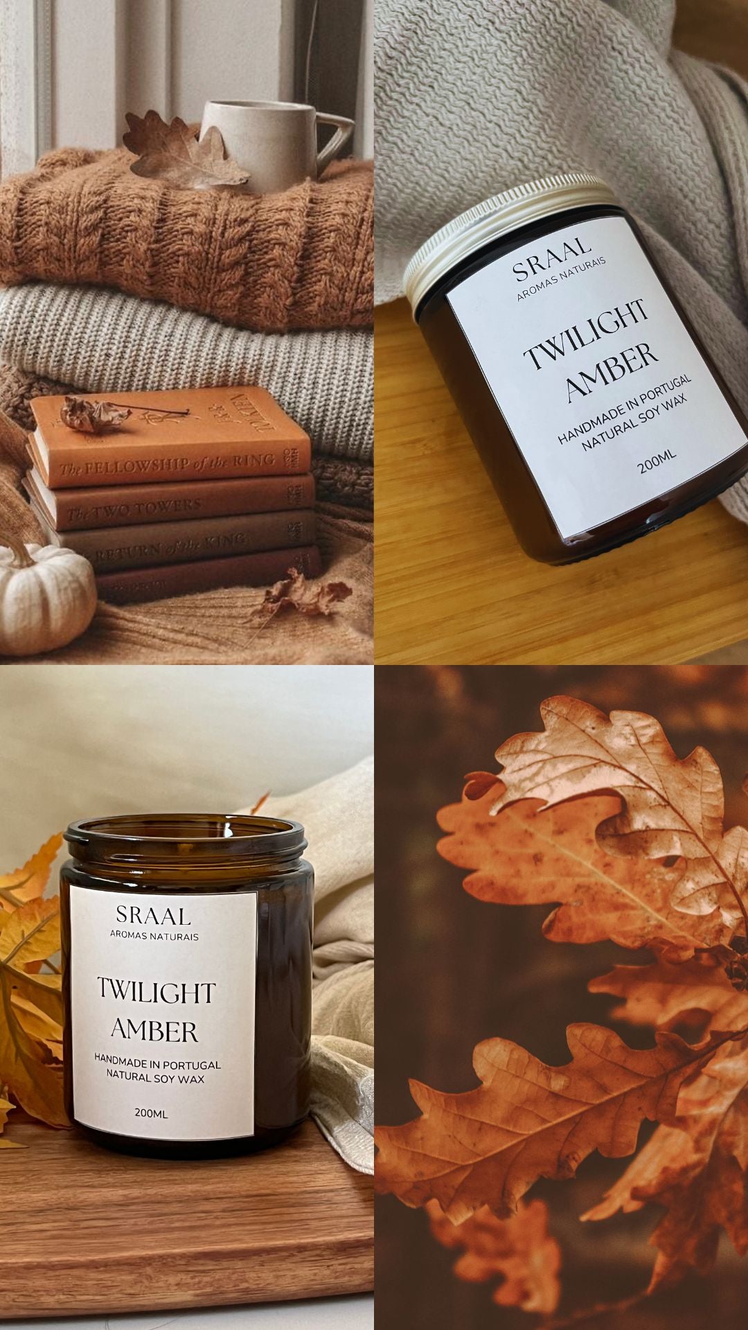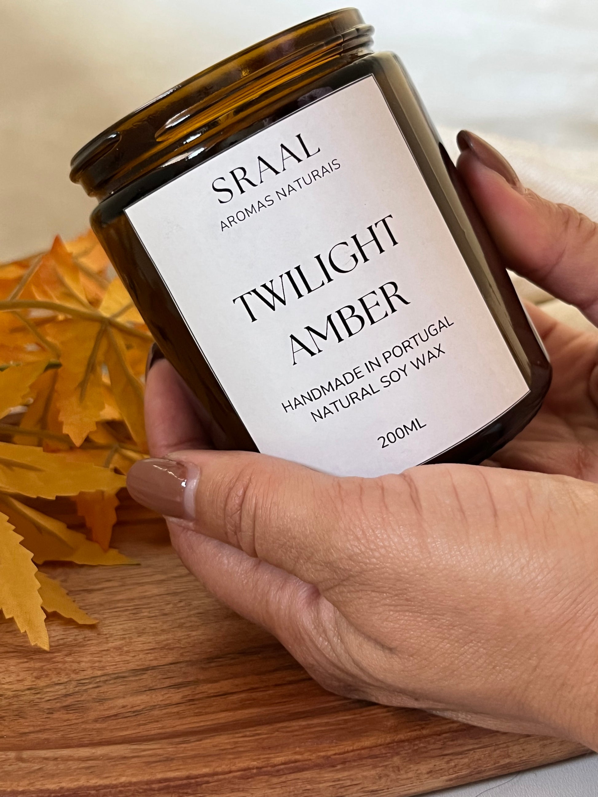 Twilight é uma vela em copo âmbar, com aroma Amber Noir, com notas quentes e profundas de âmbar e especiarias que transformam o ambiente num refúgio acolhedor.