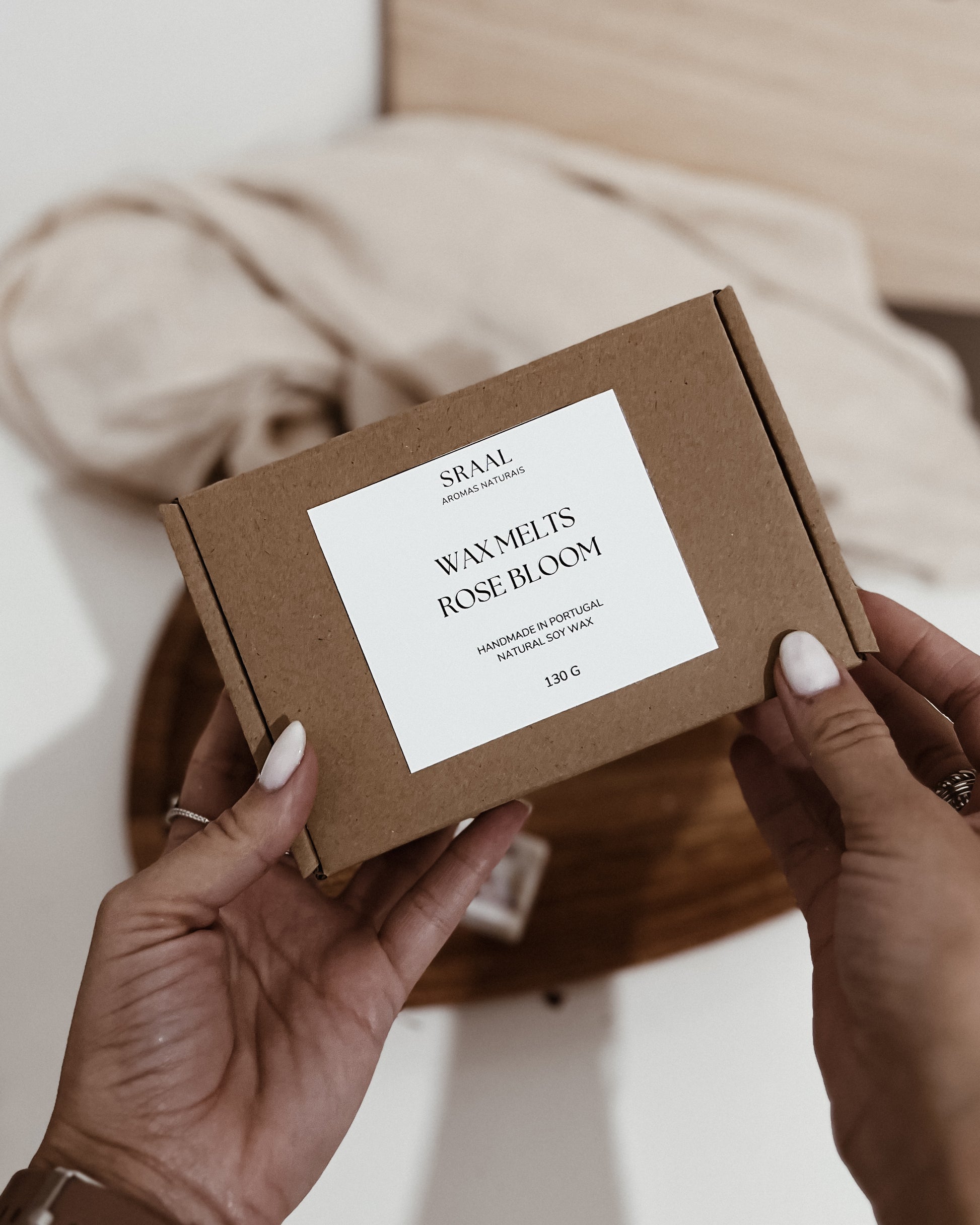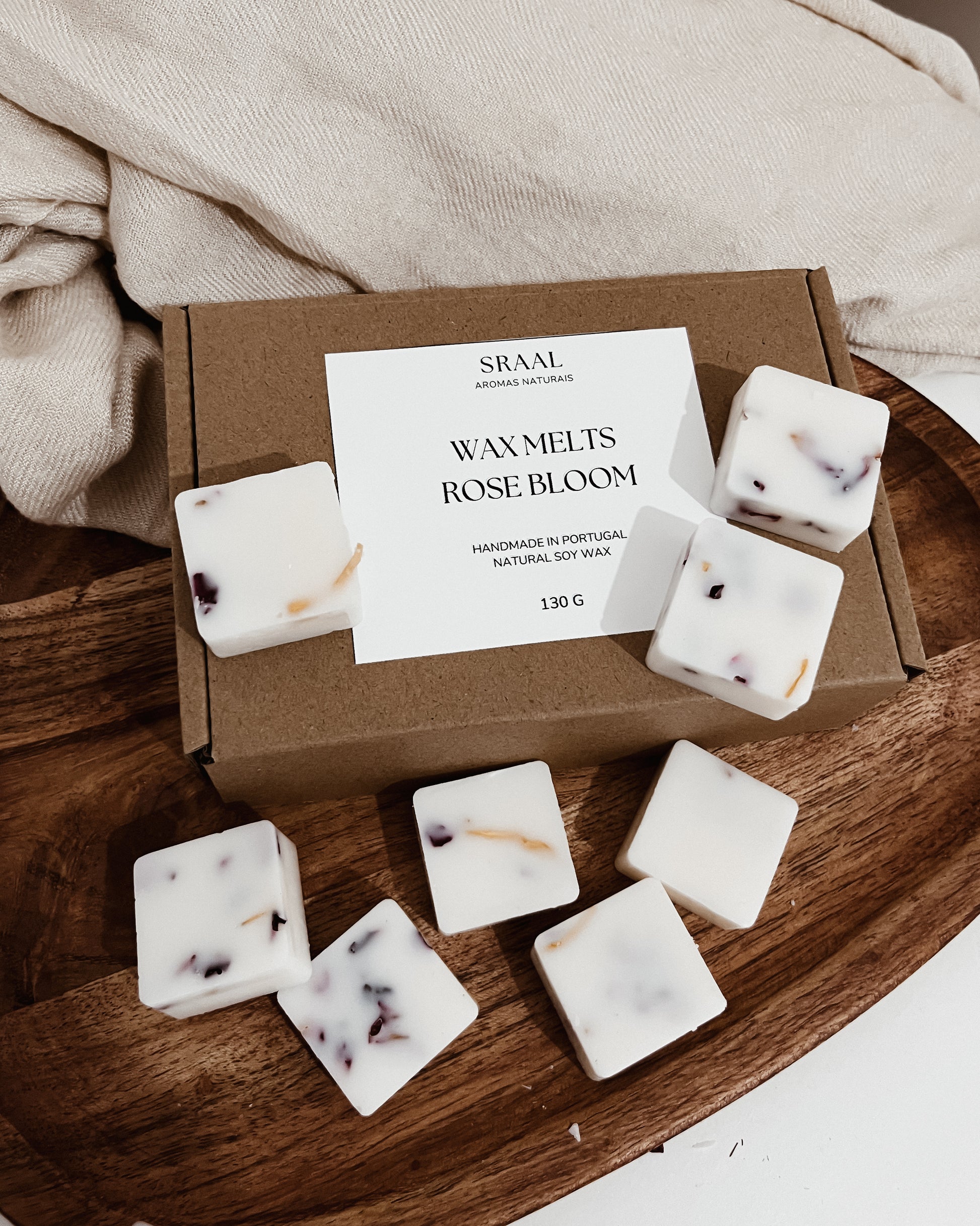 Todas as nossas velas SRAAL são feitas com 100% de cera de soja, fragrâncias vegan e premium, pavios de algodão e pavios de madeira natural.
